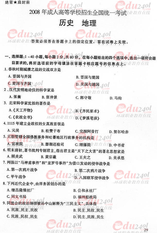 2008年成人高考高起點歷史地理試題