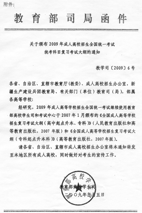 現將教育部《關于頒布2009年成人高校招生全國統一考試統考科目復習考試大綱的通知》(教學司〔2009〕6號)(見附件)轉發給你們,請你們按此通知要求,通過多種方式,積極做好對考生的宣傳工作。