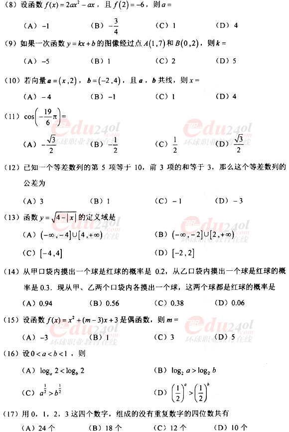 當前位置: 首頁 > 成人高考 > 成人高考歷年試題 > 2010年全國成人高考高起點數學(文)真題及答案