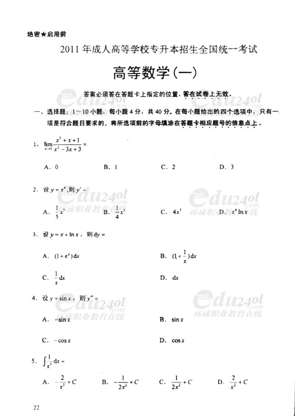 2011年成人高考(專升本)高等數學(一)試卷及答案