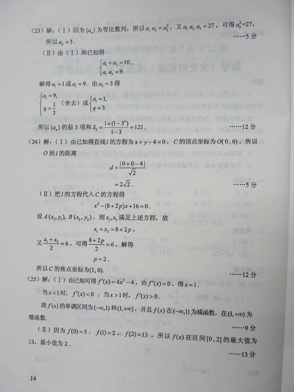 2012年成考高起點數學(文)真題答案(完整無水印版)