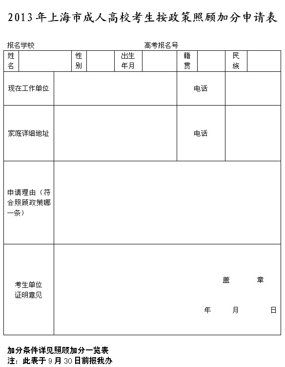 上海市2013年成人高校考生按政策照顧加分申請表