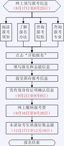 一、考生網上報名時間是8月17日至8月25日,每天8:30至17:00;考生網上報名的同時填報一志愿。網址:山東省教育招生考試院網站(http://www.sdzk.gov.cn)或http://crbm.sdzk.gov.cn/。