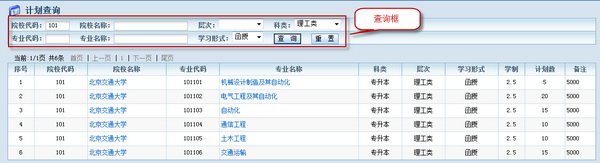 考生可以點擊進入查詢相關(guān)的院校和專業(yè)信息,如下圖所示,例如選擇院校為“101”、“理工科類”、“函授”查詢的結(jié)果如下: