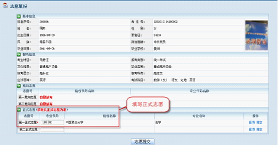注意:考生基本信息和報考信息不能修改,只能填寫正式志愿。“正式志愿”與“意向志愿”的學(xué)習(xí)層次、科類必須相同,所報院校或?qū)I(yè)可以不同。未在指定時間填報“正式志愿”的考生,默認(rèn)其“意向志愿”為“正式志愿”。如因某些院校和專業(yè)由于填報人數(shù)達不到辦學(xué)要求其招生計劃被調(diào)整或取消導(dǎo)致無法正常投檔和錄取的,后果由考生自己承擔(dān)。省招生考試院將在填報正式志愿前通過省招生考試院網(wǎng)站公布此類被調(diào)整的招生院校及專業(yè)。