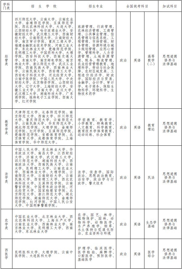 2013年云南省各類成人高等學校專升本招生專業(yè)及考試科目(表一)