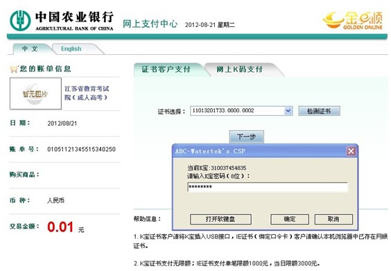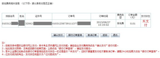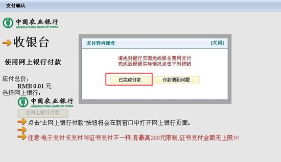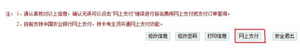 1.僅支持中國農業(yè)銀行網上支付,持卡考生須開通網上銀行功能,支付費用點擊“確認支付”進行付款。