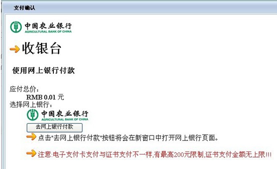 4.點擊“去網上銀行付款”,系統(tǒng)將跳轉到農行支付網站。按照網站提示步驟完成網上支付。如圖 4和圖 5。