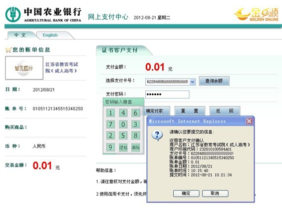 江蘇省2013年成人高考網上費用支付說明