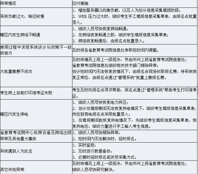系統在運行過程中,一旦發生以下各類情況和其他不可預知的情況,各市州要及時報告我院信息處,由我院啟動相應處置措施,各市州、縣市區及報名點須快速予以響應和執行。