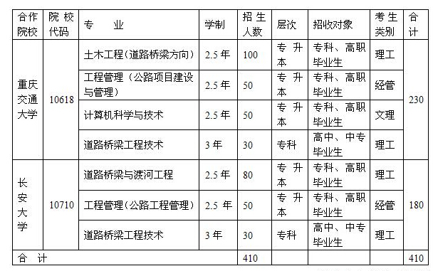 目前我院成人函授教育的專業(yè)層次有高中起點(diǎn)專科、專科起點(diǎn)本科兩種。專升本開(kāi)設(shè)的專業(yè)主要有:道路橋梁與渡河工程(專升本)、工程管理專升本(公路工程管理、公路項(xiàng)目建設(shè)與管理方向)、土木工程專升本(道路橋梁工程方向)、計(jì)算機(jī)科學(xué)與技術(shù)(專升本)。專科開(kāi)設(shè)的專業(yè)主要有:道路橋梁工程技術(shù)、公路工程與管理、工程機(jī)械運(yùn)用與維護(hù)等。此外,新增設(shè)專業(yè)還可根據(jù)用人單位和市場(chǎng)需要進(jìn)行申報(bào)。