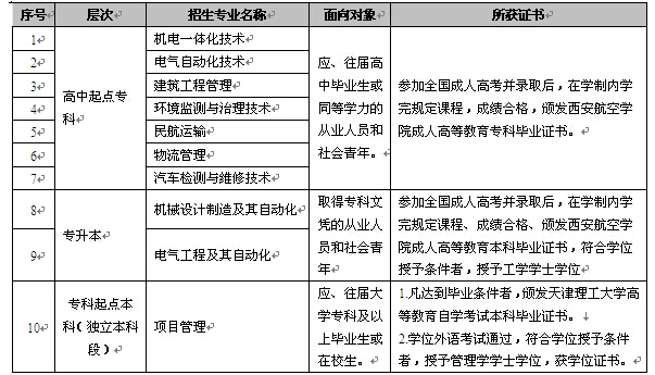 西安航空學院2014年成人高考招生簡章