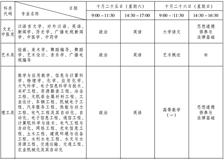 2、藝術類考試科目為:政治、英語、藝術概論、專業課由學校自行組織考試;