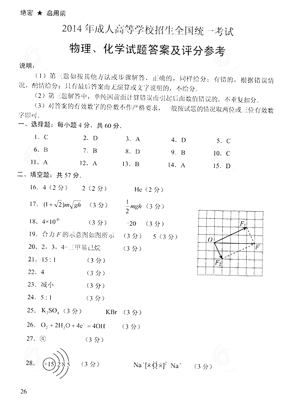 2014年成人高考高起點(diǎn)理化真題答案