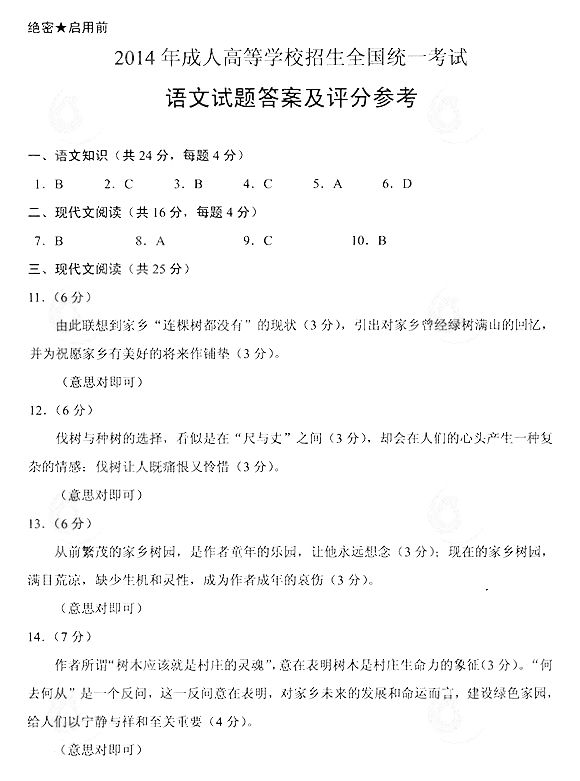 摘要 2014年成人高考高起點語文真題答案,環球網校為您提供!