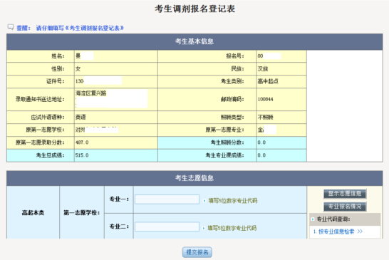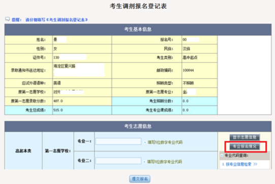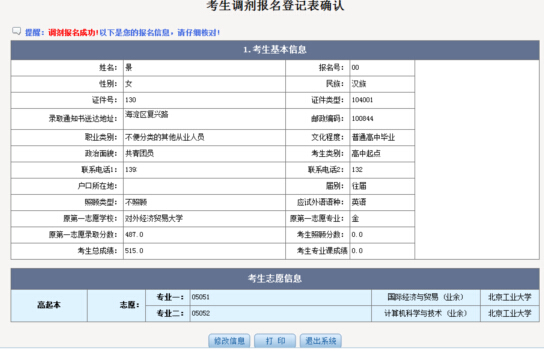3、 提交報名信息,成功后再次核實(shí)報名信息,報名完成。可以打印調(diào)劑報名登記表或重新修改填報的調(diào)劑志愿:
