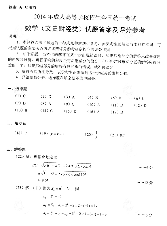 摘要 2014年成人高考高起點數學(文)真題答案,環球網校為您提供!