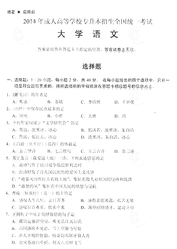 摘要 2014年成人高考專升本語文真題,環(huán)球網(wǎng)校為您提供!