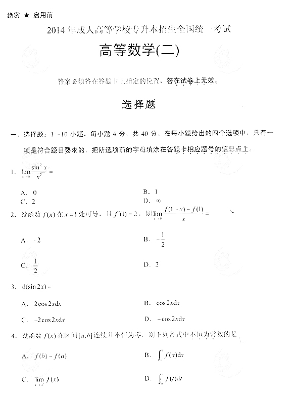摘要 2014年成人高考專升本高數(二)真題,環球網校為您提供!