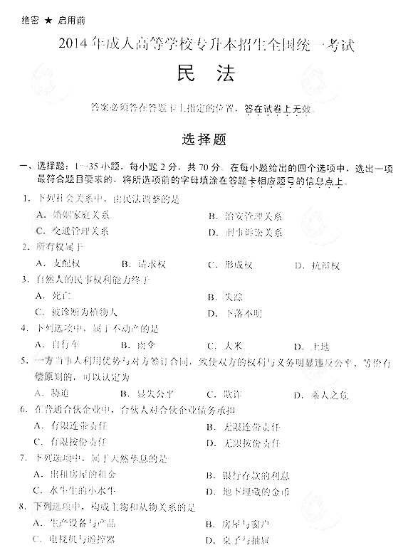 摘要 2014年成人高考專升本民法真題,環球網校為您提供!