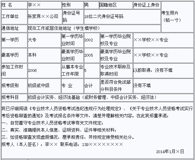 張家界2013年初級考試登記表填寫樣表及資格審查常見問題解答