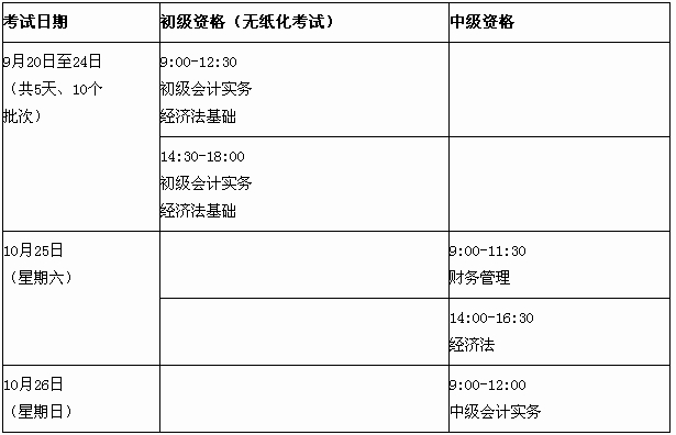 初級資格無紙化考試于9月20日―24日舉行(共5天,10個批次,具體考試批次和時間以準考證注明時間為準)。參加初級資格考試的考生,在一個考試年度內只能報名參加一次考試。初級資格的《初級會計實務》科目考試時間為2個小時,《經濟法基礎》科目的考試時間為1.5小時,兩個科目考試時間共計3.5小時;兩個科目連續考試,分別計算考試成績。