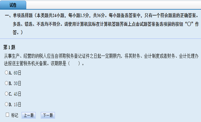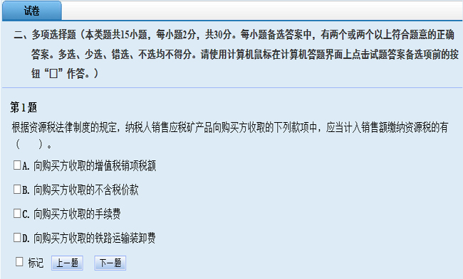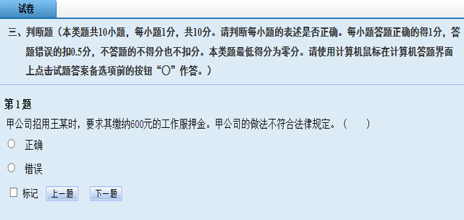 2.在答題過程中,如果考生需要提醒自己稍后返回檢查當前試題,可以用鼠標點擊本題下方“標記”選擇框進行標記。用鼠標再次點擊該選擇框可以取消本題標記。