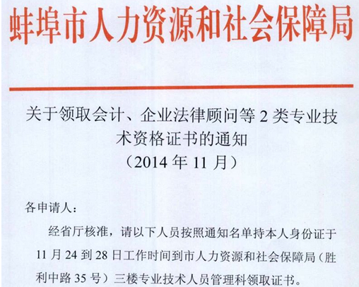 摘要 蚌埠市2014年初級會計職稱證書領取通知