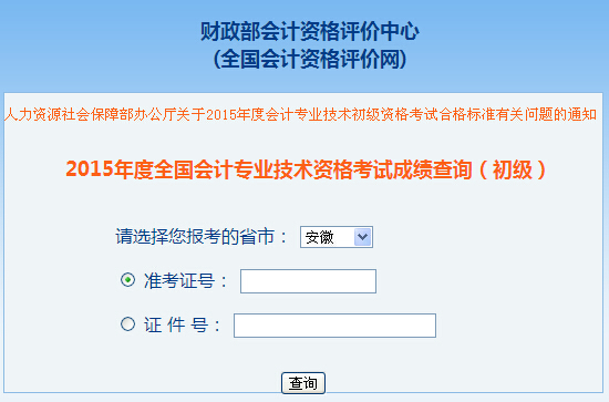 摘要 安徽2015年初級會計職稱成績查詢入口查詢網址:全國會計資格評價網http://kzp.mof.gov.cn/cjcx/cjcx1_n.jsp