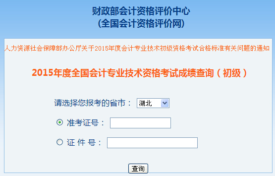 摘要 湖北2015年初級會計職稱成績查詢入口 查詢網址:全國會計資格評價網http://kzp.mof.gov.cn/cjcx/cjcx1_n.jsp