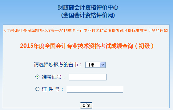 摘要 甘肅2015年初級會計職稱成績查詢入口 查詢網址:全國會計資格評價網http://kzp.mof.gov.cn/cjcx/cjcx1_n.jsp