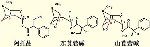 氨基醇的酯類化合物,結構中含三元橋氧時中樞作用增強,含羥基時中樞作用減弱。對中樞作用:東莨菪堿>阿托品>樟柳堿>山莨菪堿