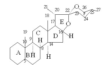 1、皂苷元結(jié)構(gòu)特點:皂苷元由27個碳組成,共有A.B.C.D.E和F六個環(huán).其中E和F以螺縮酮的形式連接,共同組成螺旋甾烷.