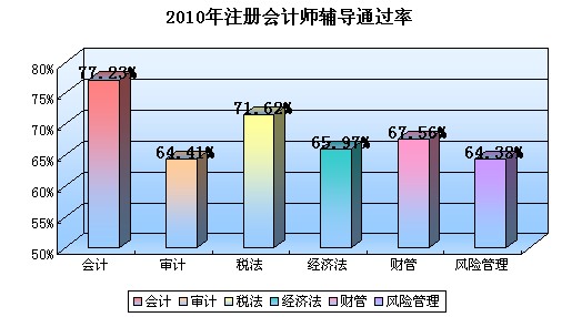 通過對網校學員的電話回訪,統計出網校2010年注冊會計師考試輔導通過率情況為: 《會計》77.23%,《審計》64.41%,《稅法》71.62%,《經濟法》65.97%,《財務成本管理》67.56%,《戰略與風險管理》64.38%。