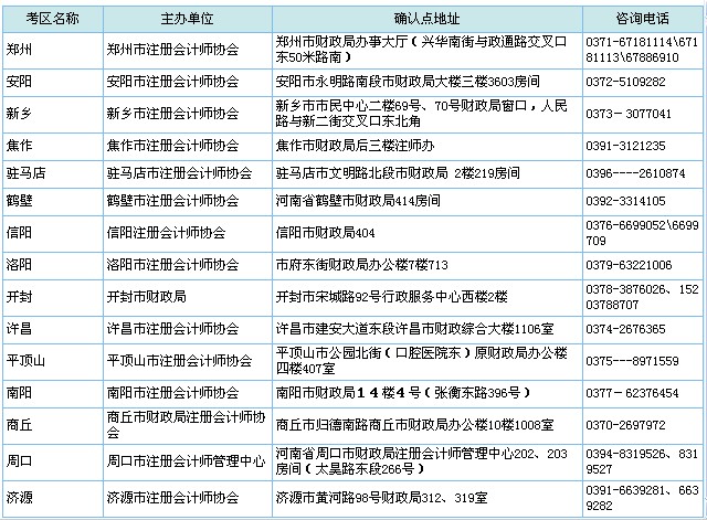 河南省2013年注冊會計師資格審核確認點地址及電話