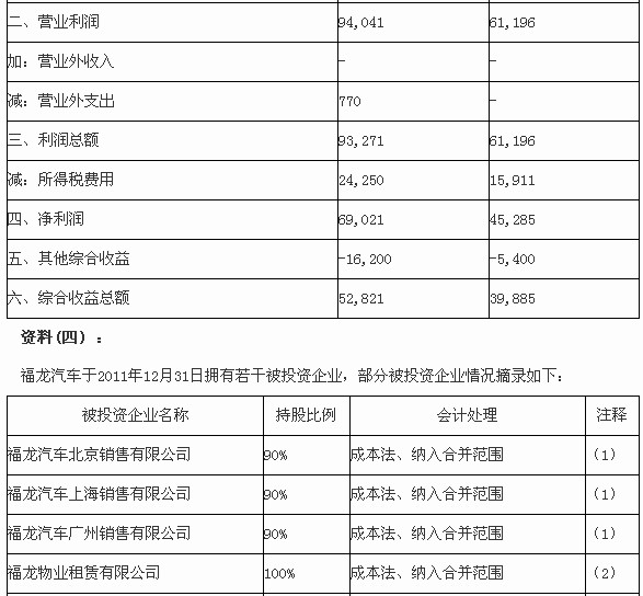 (1)福龍汽車北京銷售有限公司(以下簡稱北京公司)、福龍汽車上海銷售有限公司(以下簡稱上海公司)和福龍汽車廣州銷售有限公司(以下簡稱廣州公司)2011年度的營業(yè)收入分別占福龍汽車合并營業(yè)收入的40%、30%和20%。