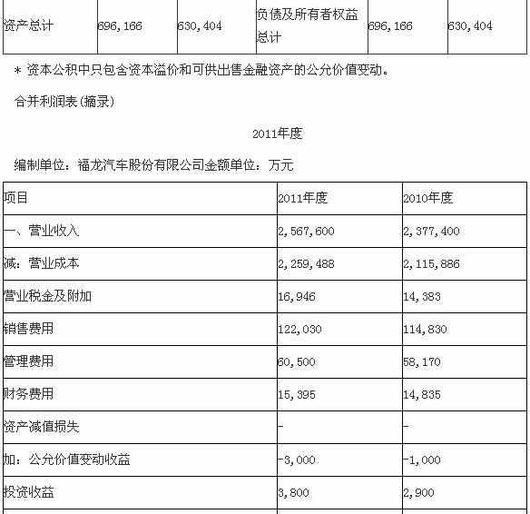 福龍汽車2011年度合并資產負債表和合并利潤表摘錄如下(其中:2010年度財務數(shù)據(jù)已經旺華會計師事務所審計,2011年度財務數(shù)據(jù)尚未經審計):