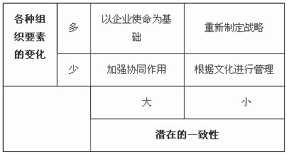 在第一象限,企業實施一個新的戰略時,重要的組織要素會發生很大變化。這些變化大多與企業目前的文化有潛在的一致性。這種企業由于有企業固有文化的大力支持,實行新戰略沒有大的困難。