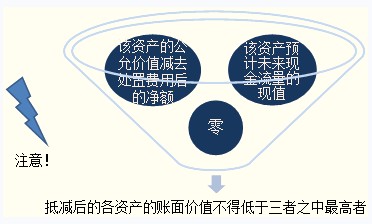 相關減值損失的處理順序和方法與資產組減值損失的處理順序和方法相一致。抵減后的各資產的賬面價值不得低于以下三者之中最高者: