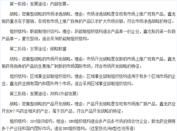 三、鑫龍制藥的三個(gè)發(fā)展階段實(shí)現(xiàn)途徑是什么?各自適用密集型戰(zhàn)略中的何種細(xì)分戰(zhàn)略,理由?各自適用的組織結(jié)構(gòu)類型是什么,理由。