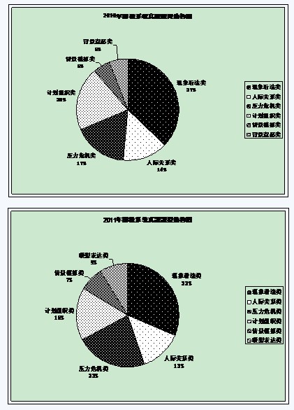 【題型比重】2010年現象看法類占37%、人際關系類占14%、壓力危機類占17%、計劃組織類占20%、背景意愿類占6%、情景模擬類題占6%。2011年出過現象看法類占32%、人際關系類占13%、壓力危機類占23%、計劃組織類占16%、情景模擬類占7%、聯想表達類占9%。
