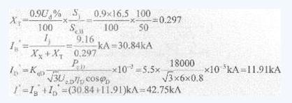 (3)每臺機6.3kV母線分為A、B二段,每段接有6kV電動機總容量為18MW,當母線發生三相短路時,其短路電流周期分量的起始值為下列哪項數值?(設系統阻抗為0,KqD取5.5)