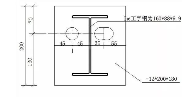 1、根據選定的16#工字鋼的長度和鐵板的大小及厚度繪制加工平面圖,見下圖,對工人進行交底,現場用氧氣切割下料,同時也可委托加工廠進行成品加工。