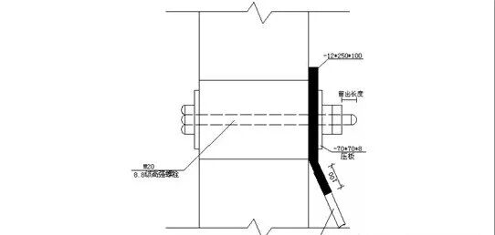7.7斜拉桿上拉點鐵板外側配備70*70*8壓板,在壓板外配設雙螺母,螺栓端外露長度≥1只螺母厚度。確保該點使用可靠不變形。