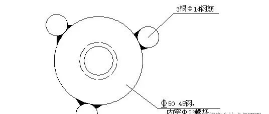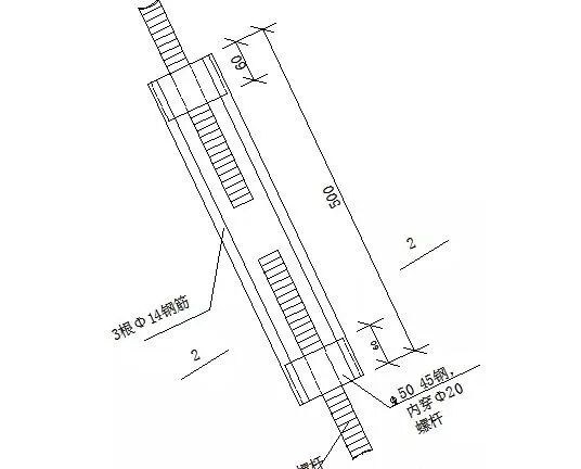 2、取Φ20*1.6米、Φ20*1.0米碳素優質鋼與三根Φ14碳素優質鋼進行雙面焊接,加工成型的花籃螺栓進行組合安裝(正反牙具),見圖5.3.2-2。