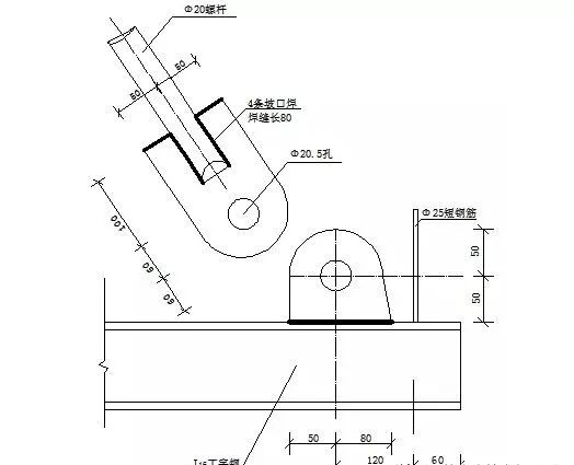 2、上端Φ20*1.6米碳素優質鋼與250*10*12㎜鐵板彎曲成20度(根據樓層面而定),打孔切割槽距(槽距為20*100)后進行坡口焊接,見圖5.3.2-7。