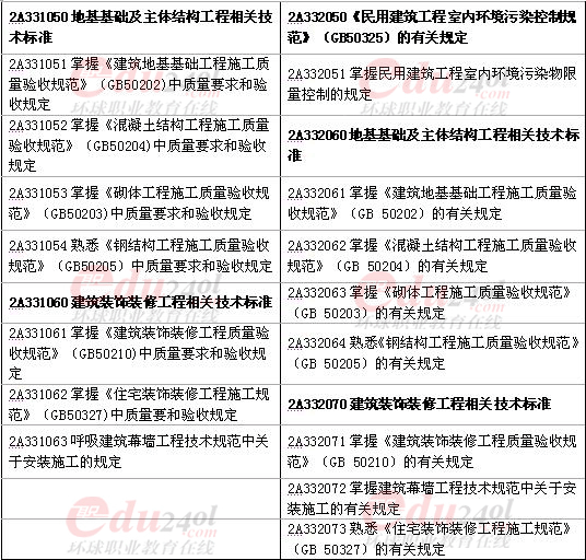 在這章中,刪除了廢止的規章制度,補充了國家頒布的有關建筑節能方面的法規、注冊建筑師執業工程規模及注冊建造師在施工管理簽章文件的有關規定;增加了《工程建設施工企事業質量管理》(GB/T50430)的有關規定。