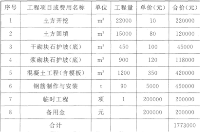 1.臨時(shí)費(fèi)用不應(yīng)計(jì)入,承包人為其臨時(shí)工程所需進(jìn)行的費(fèi)用由承包人自行承擔(dān);土方回填工程和漿砌塊石護(hù)坡(底)工程計(jì)算錯(cuò)誤,按單價(jià)與工程量的乘積與總價(jià)之間不一致時(shí),以單價(jià)為準(zhǔn)的原則進(jìn)行修正。修正后的投標(biāo)報(bào)價(jià)為264.3萬元。