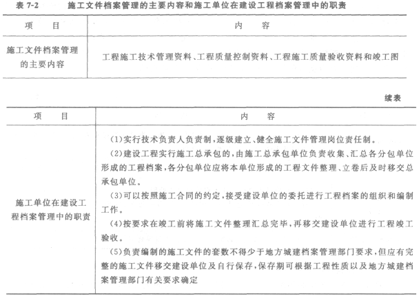 1.施工文件檔案管理的主要內容和施工單位在建設工程檔案管理中的職責(表7―2)