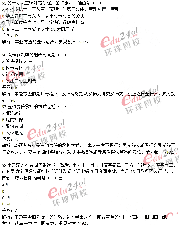 55.該題根據《女職工特殊勞動保護條例》,產假應該是14周(13版教材已經變更),但是90天的規定是《勞動法》體現的,所以D也不能說錯。對于《女職工特殊勞動保護條例》中第十一條:用人單位應當每2年至少安排1次女職工進行婦女常見病檢查,檢查時間算作勞動時間。可以認定為選項B正確(雖然這個并沒有體現在教材中)。可以認為這是一道超綱題,BD都有相應的正確的理由。